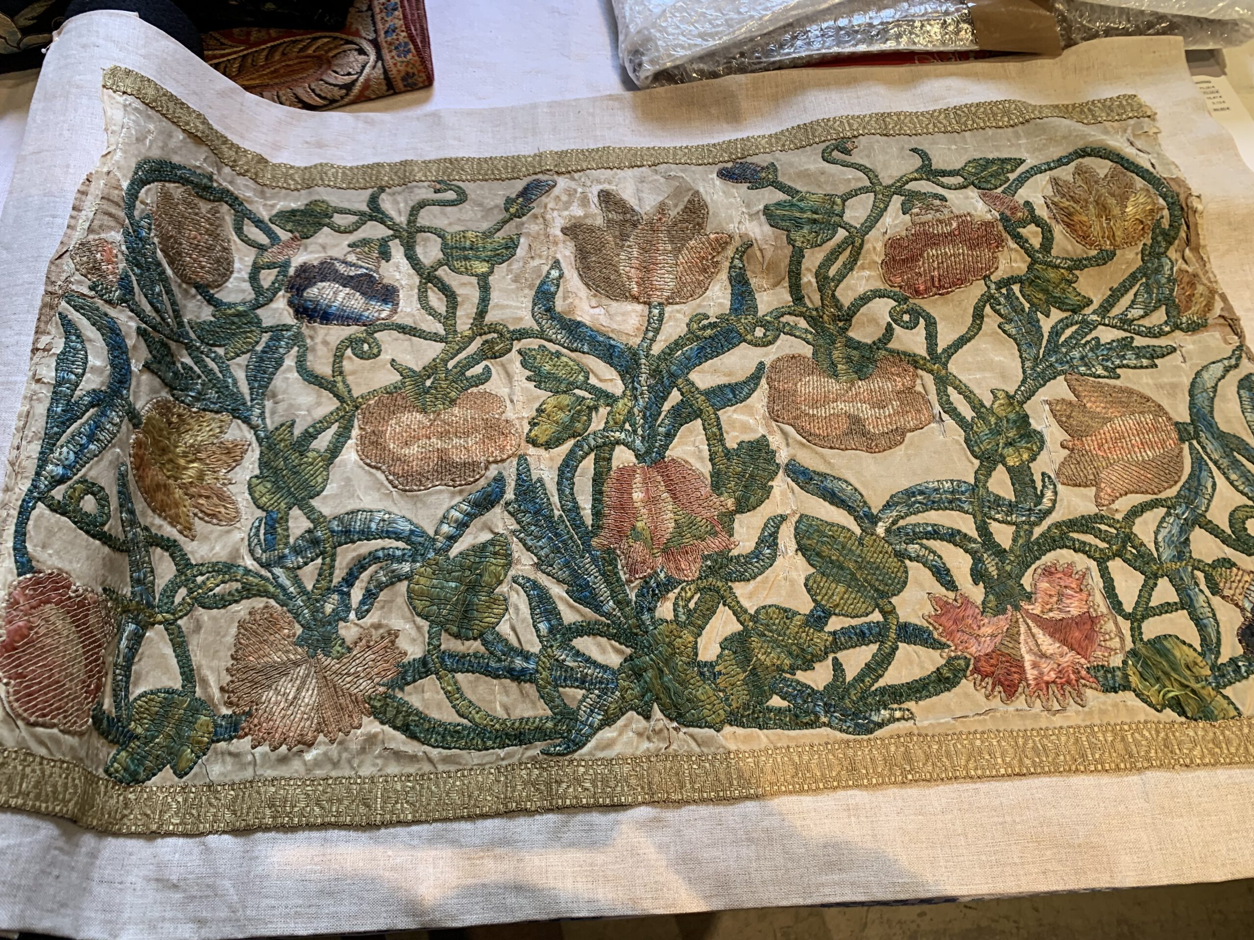 Foto 1. Ein paar schöne Stücke! Foto 2. Dieses silbergemusterte Textil aus Indien ist eine tolle Kulisse für eine deutsche gotische Skulptur. Foto 3. Ein türkisches Textil und eine italienische Stickerei, ein Füllhorn.