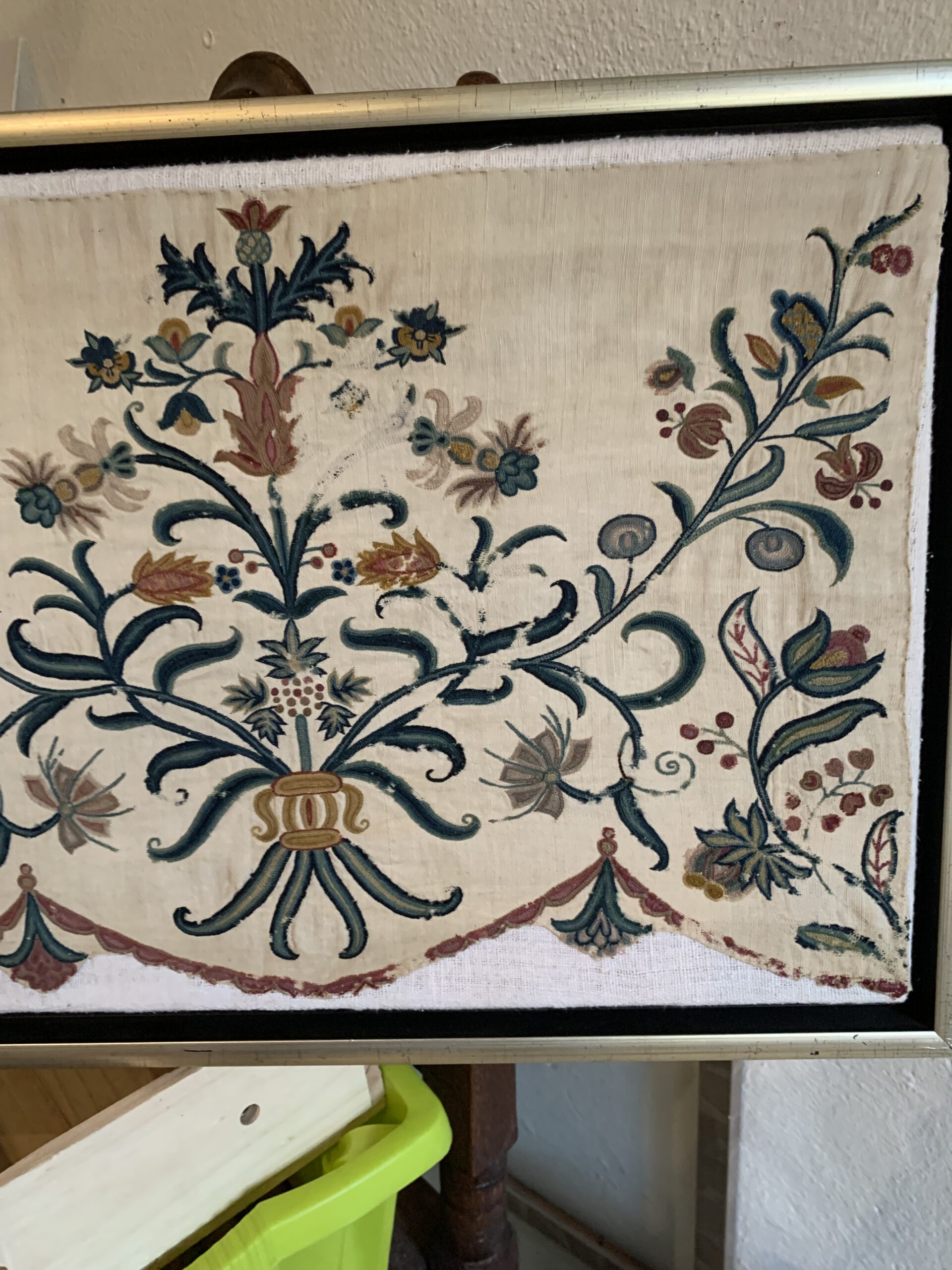 Info: Diese Stickerei ist besonders fein gezeichnet und elegant, die Farbe – grün und rot – ist besonders ansprechend. Guter Zustand. Es gibt noch drei weitere Paneele in ähnlicher Größe.